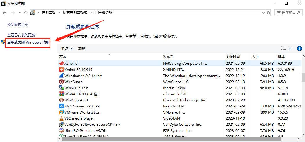 在 "控制面板" 界面,点击 "程序和功能"。在 "程序和功能"中点击 "启用或关闭 Windows 功能",打开 "Windows 功能" 弹窗。