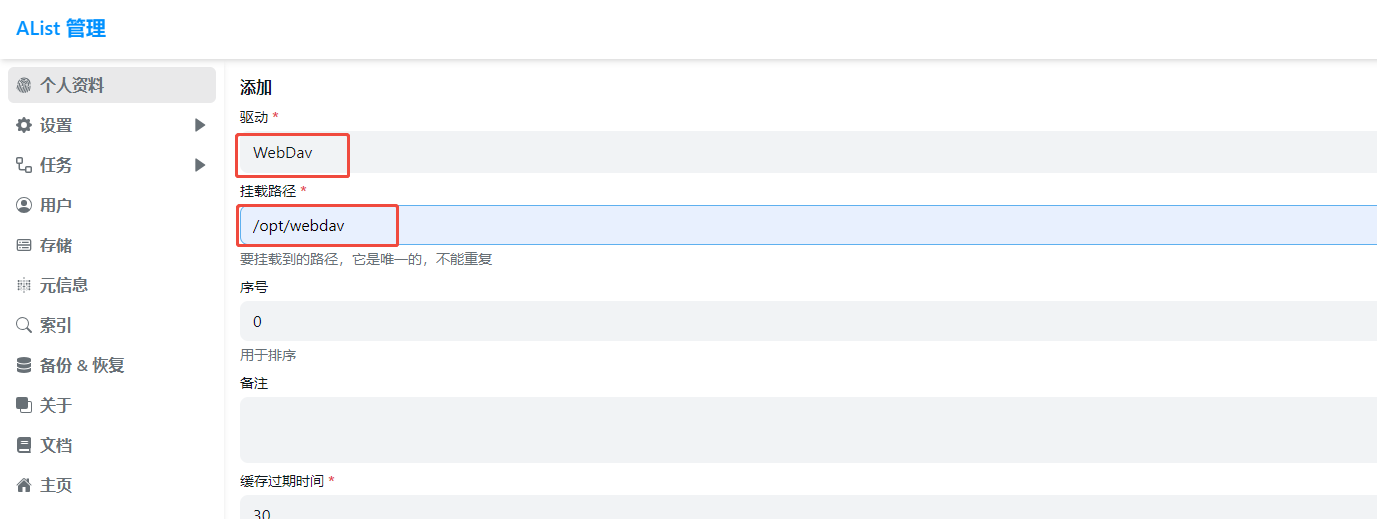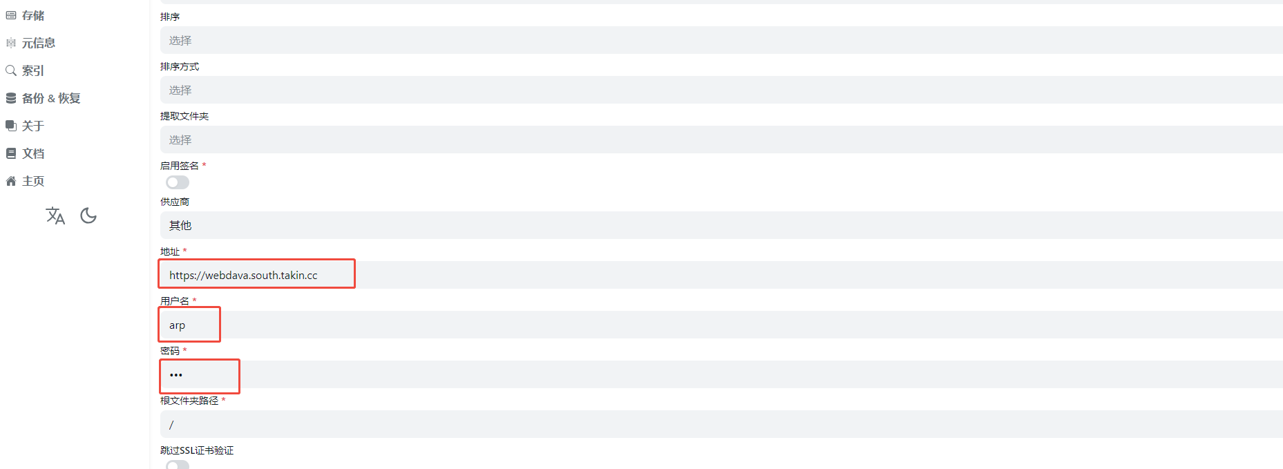 /opt/webdav - 地址:输入 Webdav 存储站点的访问地址,如
