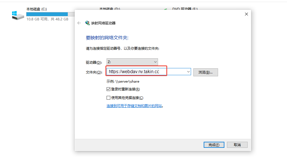 在添加映射网络驱动器的窗口中,将 webdav 的域名地址粘贴到文件夹输入框中