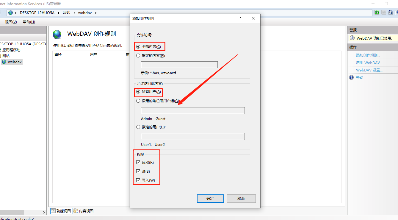 - 点击 "添加创作规则" 添加 WebDAV 网站的访问规则,权限勾选 "读取", "源", "写入"。