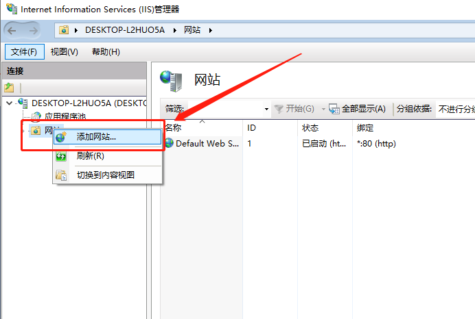- 在 IIS 管理器界面,选择左上角的 "网站",右键选择 "添加网站"。