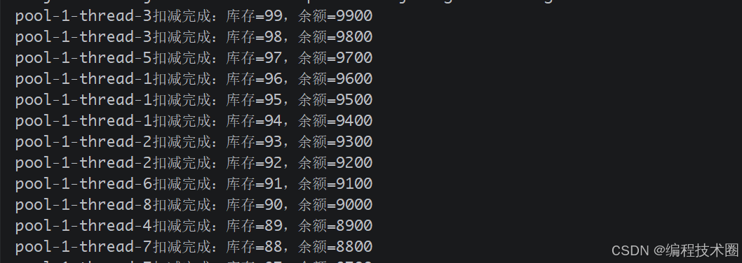 System.out.println(Thread.currentThread().getName() + "扣减完成:库存=" + stock + ",余额=" + balance);