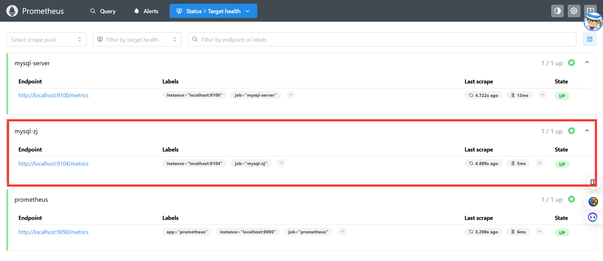 访问Prometheus Web界面(http://服务器IP:9090/targets),在“Status”列应看到UP状态,说明Prometheus已成功抓取mysqld_exporter 的指标。