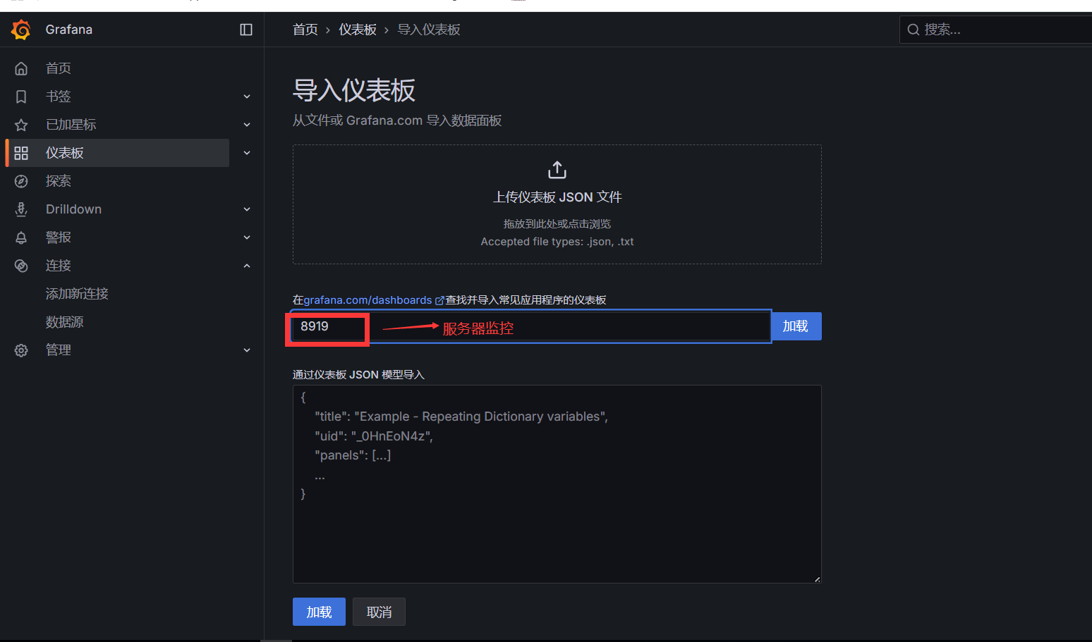 - 6.2.2导入仪表板-----》服务器监控--》8919