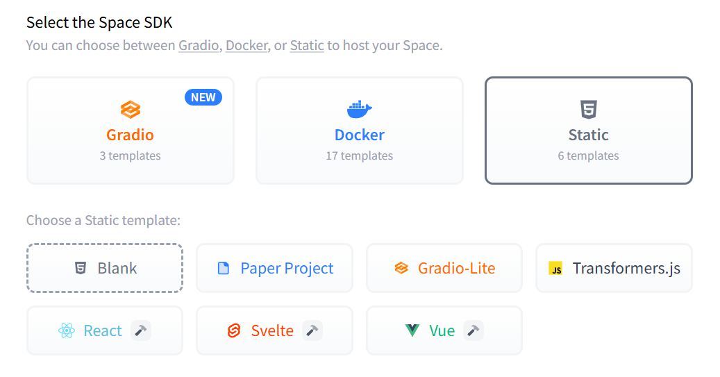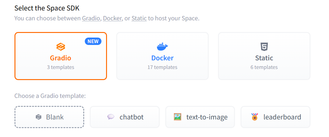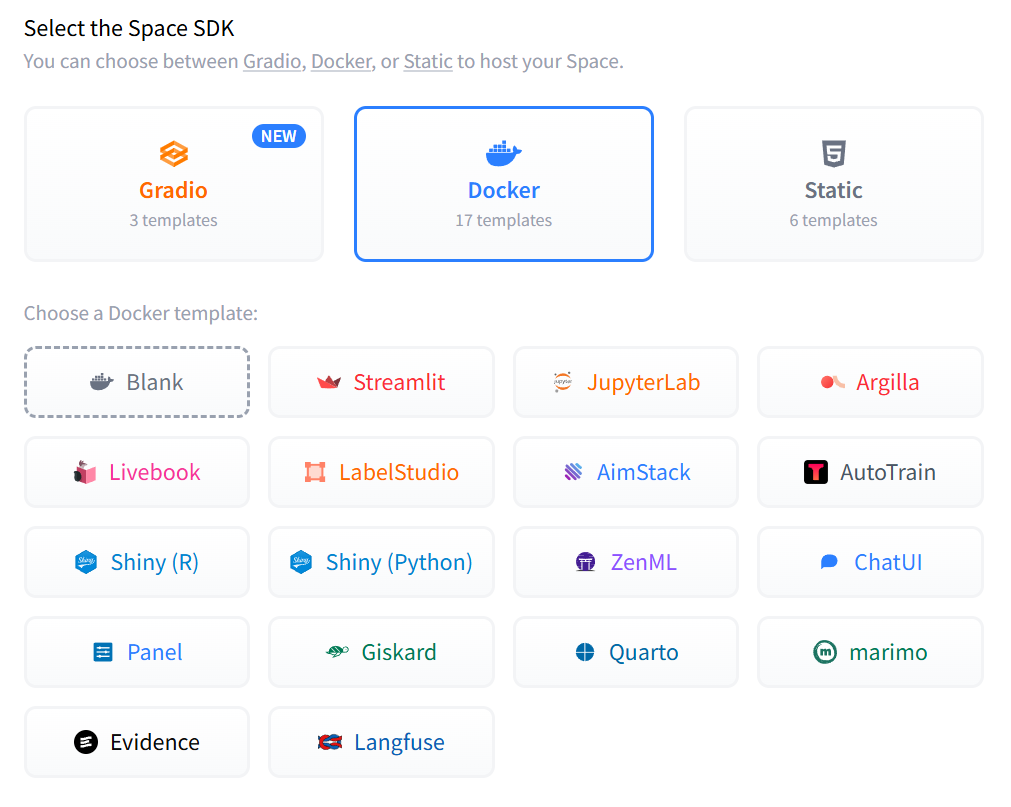 Hugging Face Spaces 提供了3种模板,可以很方便的来部署你的应用。