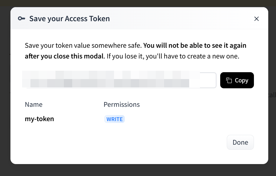 这时页面会出来一个弹窗,显示你新生成的 Token (它以 hf_ 开头 。