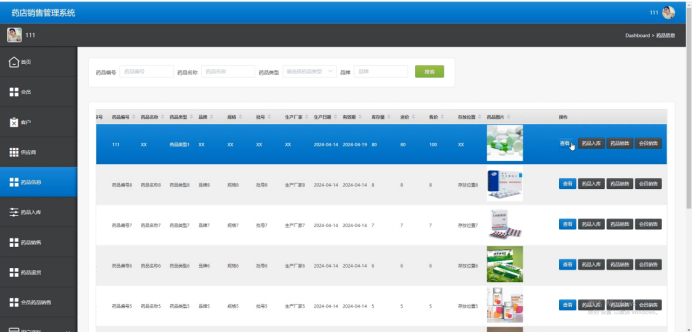 药品信息;在药品信息页面输入药品编号、药品名称、药品类型、品牌进行搜索药品信息列表,并对药品信息详细信息进行查看、药品入库、药品销售、会员销售操作;如图5-13所示: