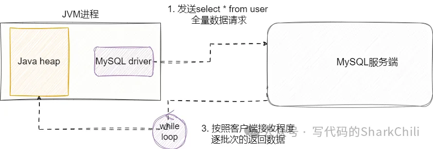 对应我们也给出流式编程的导出方案,笔者针对查询语句做了流式编程的配置,通过这些配置保证MySQL服务端基于自己的迭代游标按照客户端处理效率按照顺序的数据流不断传输给客户端: