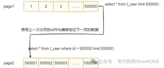 select * from t_user limit 500000 ;假如我们不以id作为索引,那么第二次的分页查询sql则是: