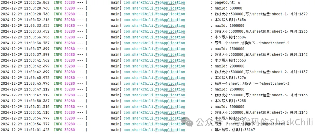 log.info("导出结束,总耗时:{}", total); 可能会有读者好奇笔者这个50w的数值设计思路是什么,除了考虑避免OOM以外,还考虑到每个sheet只能写入100w条的数据,为了方便通过分页查询的轮次确定当前写入的数据量大小,笔者尝试过20w、50w。 最终在压测结果上看出,50w读写耗时虽然是20w的2倍,但是IO次数却不到20w查询的二分之一,通过更少的IO操作获得更好的执行性能。