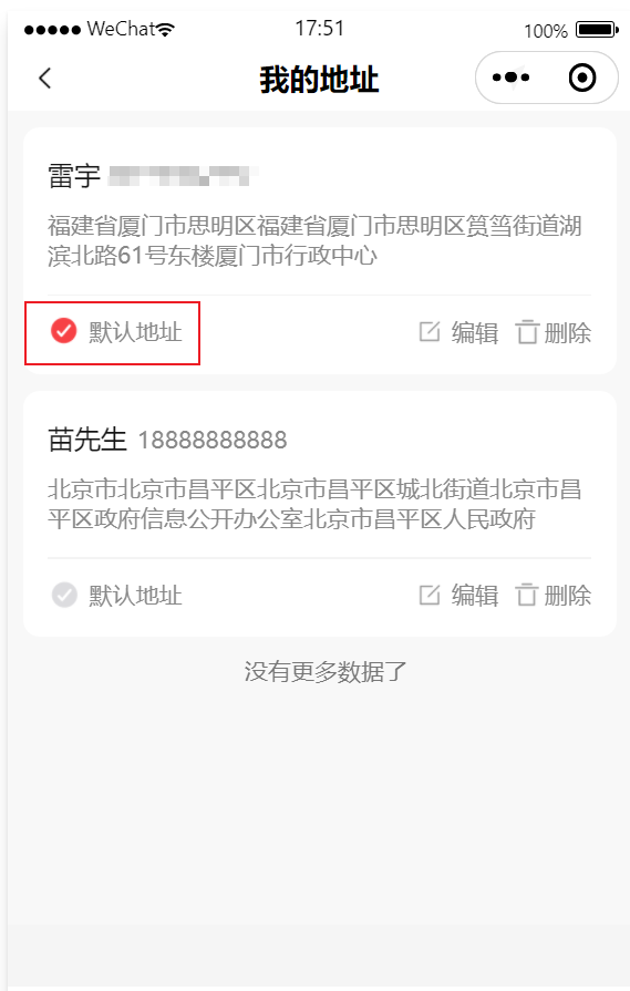 进入我的地址,点击默认地址将当前地址设置为默认地址