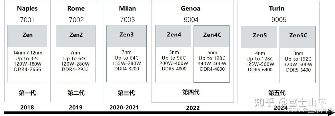 反观 AMD,在基于 ZEN架构的 EPYC 处理器问世之后,横扫服务器市场。本质上, AMD 同样使用了 Tick-Tock 战略,其 Tick 依赖于业界顶尖的台积电和Chiplet技术,其 Tock 则依赖于自家的 ZEN 架构不断演进。