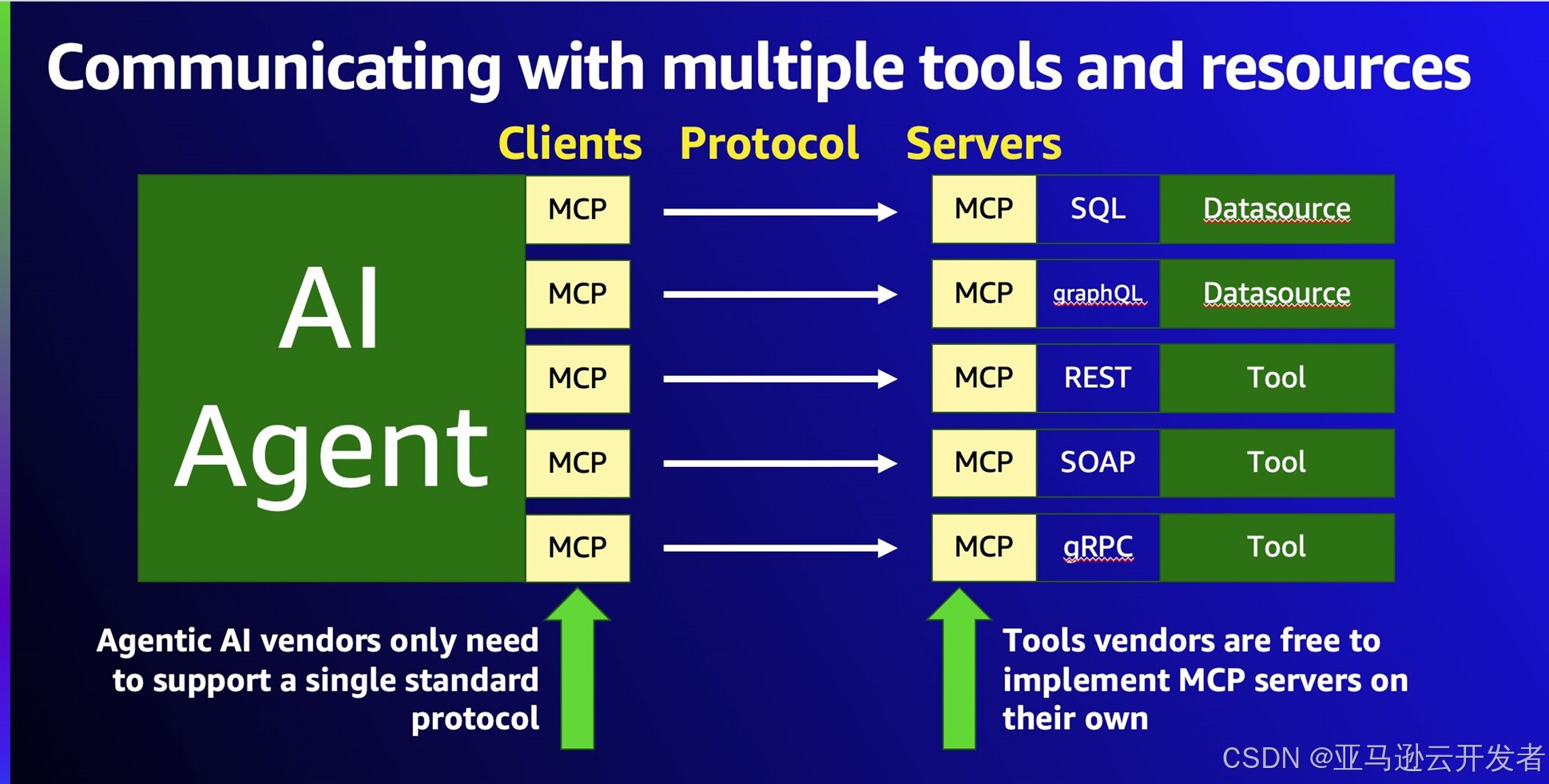 但 Agentic AI 框架内置的工具也有其局限性。内置的工具主要为基础工具,无法应对复杂的业务需求。有些业务甚至需要定制化的工具。且内置工具的版本更新和维护需要与框架的发布周期同步,工具无法单独频繁迭代。应对这种场景,就需要外挂工具,将工具与Agentic AI框架解耦。而MCP协议就应运而生。