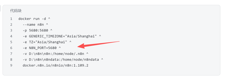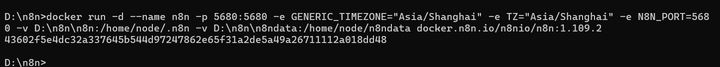 docker run -d --name n8n -p 5680:5680 -e GENERIC_TIMEZONE="Asia/Shanghai" -e TZ="Asia/Shanghai" -e N8N_PORT=5680 -v D: 8n 8n:/home/node/.n8n -v D: 8n 8ndata:/home/node/n8ndata docker.n8n.io/n8nio/n8n:1.109.2
