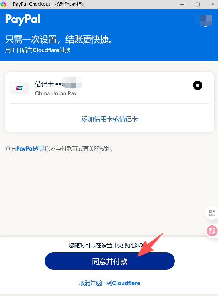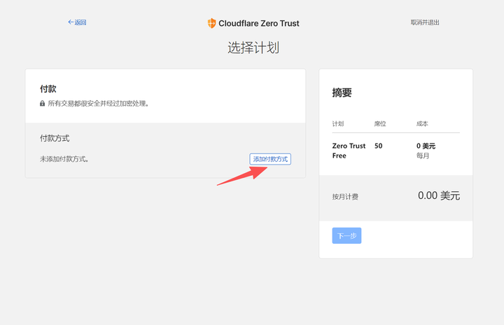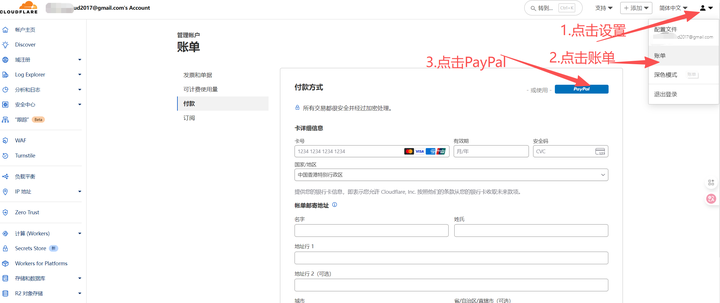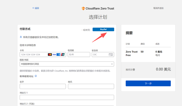 在弹窗,点【创建账户】,选择【中国】,将个人信息填写进去,绑定一张国内【银联】储蓄卡,后续用来支付cloudflare的0元服务账单。