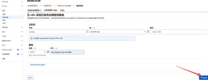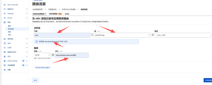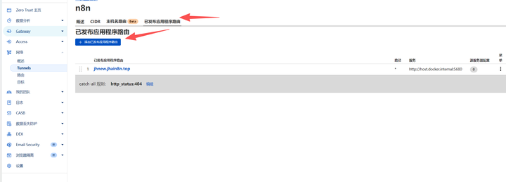 也可以这么补设路由:点 “网络”-“tunnels”,再点 “添加已发布应用程序路由”,填主机名(比如 newaa.jhain8n.top)、描述(host.docker.internal:5680),点 “保存”。成功后,像 https://newaa.jhain8n.top/ 和 https://jhnew.jhain8n.top/ 这两个域名都能打开 n8n