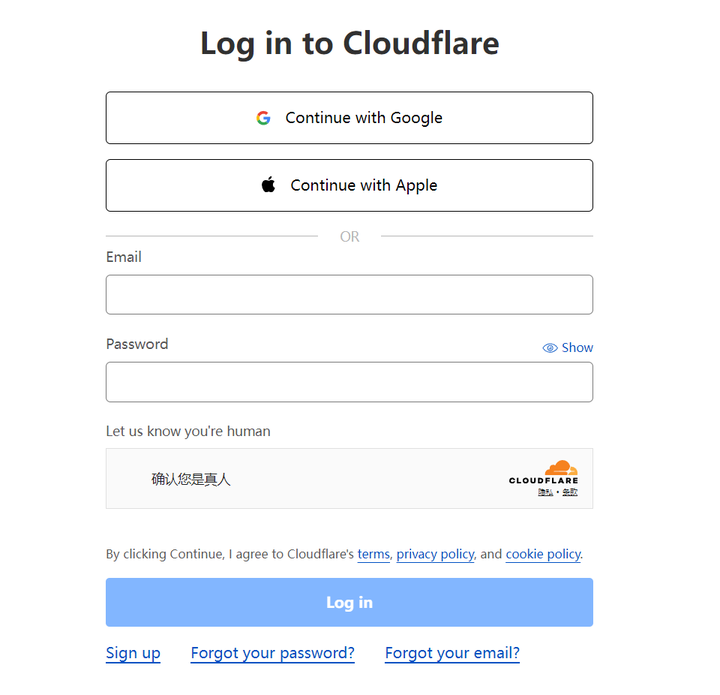 域名注册好进入Cloudflare管理平台,登录google账号