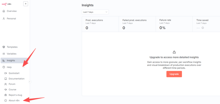 想要知道自己n8n版本号,在n8n操作界面,点【help】点【About n8n】