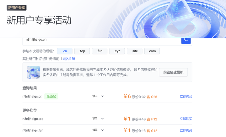 输入自己想要弄域名,如:n8n.xxx.cn,然后看到报价,并且可以看到能否注册,并根据流程完成实名注册