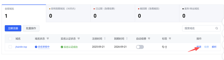 等注册好,选个适合自己的域名和后缀 —— 我考虑到之后续费方便,这次选了 top 后缀。买完去域名服务列表(https://console.volcengine.com/domain-service/domain),能看到刚注册的域名,比如我这里显示 jhain8n.top,确认状态正常就好。
