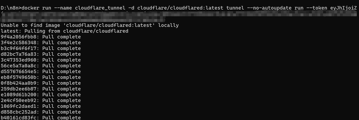 docker run --name cloudflare_tunnel -d cloudflare/cloudflared:latest tunnel --no-autoupdate run --token eyJhIjoiZjcxOGVlODI0OTc0NTM4YWZmYWM5NGY4OTBhNmM0Y2EiLCJ0IjoiMDRkNGIyZTAtODIwMS00MTJlLWFiMGEtZjc2OGY2YmY2NmEyIiwicyI6Ik1qQm1aRFEyT0RRdE1UWmpaQzAwTjJNMUxUa3dOakV0WkdWak5qUmpZamsyWWpBdyJ9