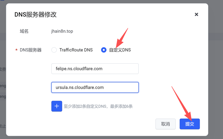 (3)复制Cloudflare服务器名称,并提交