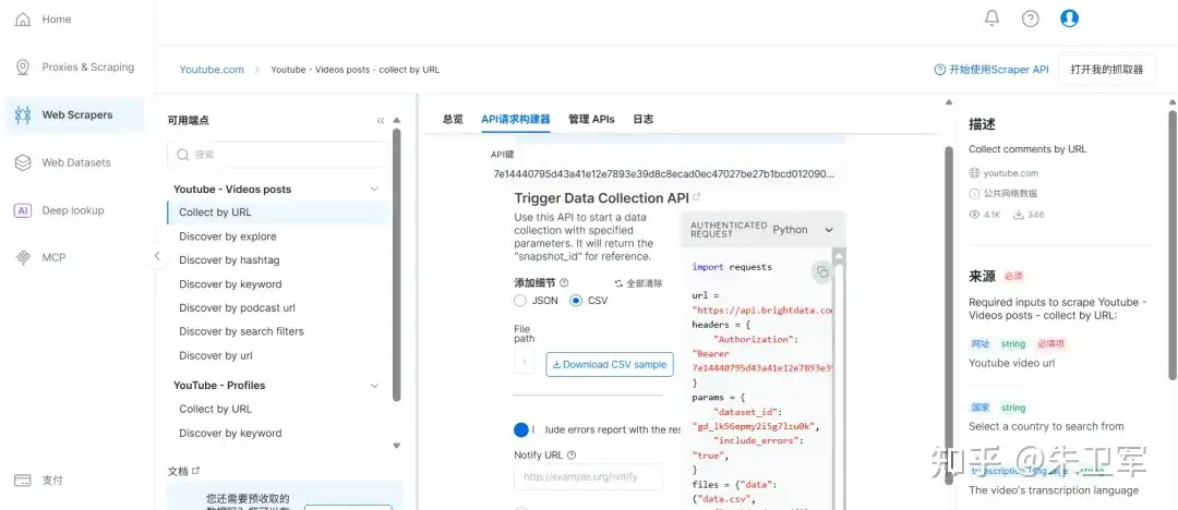 我让这位同事去亮数据官网找到了专门用于Youtube的网页抓取API,能直接通过requests访问并获取相应的视频、评论、互动等数据。