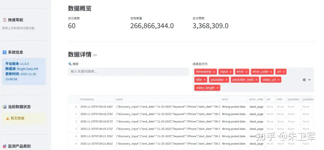 如果觉得写代码比较麻烦,你可以尝试将以上的采集API封装到web应用里,通过可视化的界面来采集、分析Youtube数据。