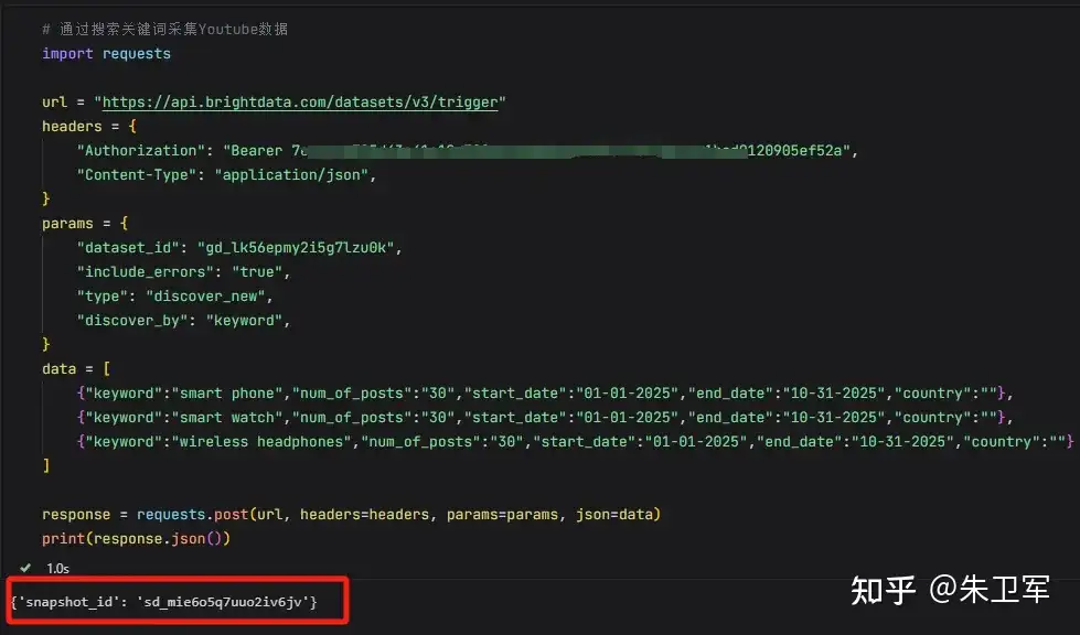 数据采集任务开始后,代码会返回一个snapshot_id,代表采集的数据会保存在亮数据的数据库里,通过特定的snapshot_id可以调用,这一般需要等待几秒钟。