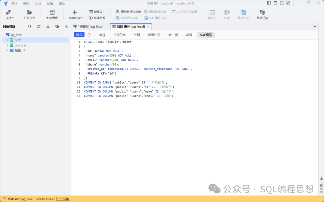 SQLark 支持对 PostgreSQL 基础对象的可视化管理,包括数据库、模式、表、视图、物化视图、函数、存储过程、序列、触发器、自定义类型和角色。