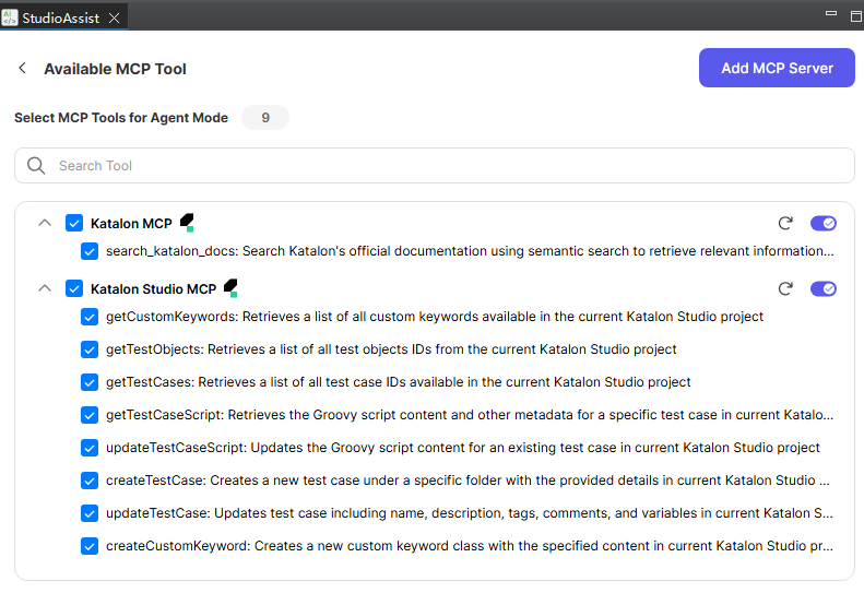 除了系统内置的MCP服务器,Katalon Studio还支持接入外部MCP服务器以扩展AI助手的功能范围。