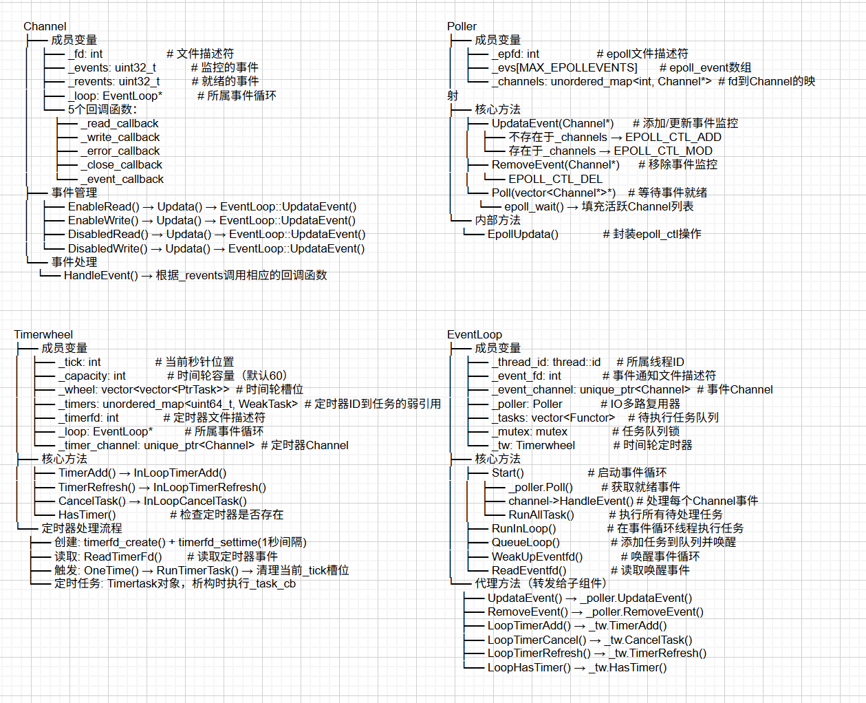Channel用于对事件监控的管理,监控实现由Poller提供,EventLoop对应一个单线程任务处理,Start()开始任务的处理,同时保证任务执行在单线程内。