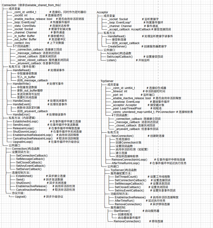 每一个连接都会被分配一个线程EventLoop,服务器可以自定义线程数量,线程轮询分配保证线程均衡,Connection使用share_ptr管理,设定超时清理connecion资源,TcpServer存储所有的Connection智能指针,并由TcpServer启动监听建立三次握手。