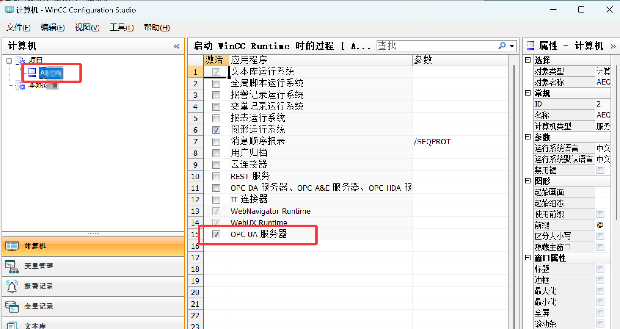 WinCC只有在WinCC Configuration Studio中选中了OPC UA服务器,才会在项目激活是启动OPC UA服务器功能。