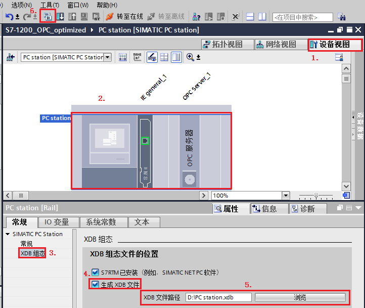 在TIA Protal “设备视图”内。选择“PC Station 站点”,在其属性对话框内,“SIMATIC PC Station ” →“XDB组态” →勾选“生成XDB文件”,并点击“浏览”设置文件存储路径。
