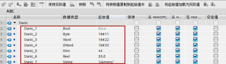 双击打开DB1,建立DB块变量,并设置初始值,下图中因为是优化的DB块,所以各变量没有绝对地址,只有符号名,如图4所示。