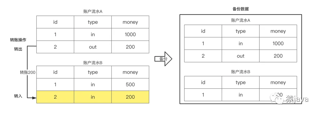 - 当账户 A 转出 200 完成,账户 B 转入 200 还未完成时,整个数据备份完成