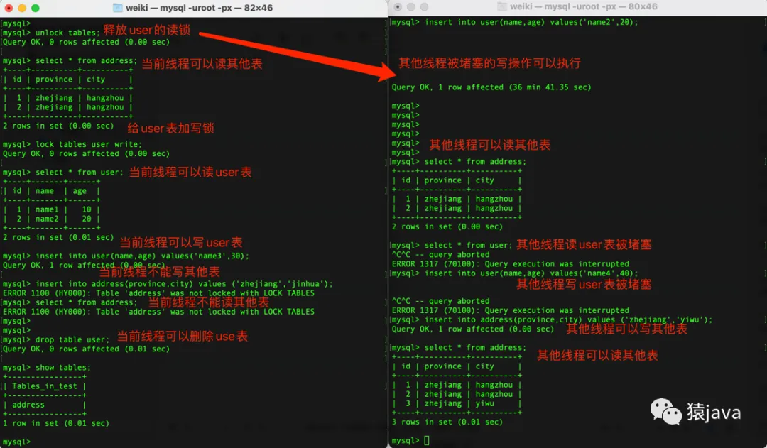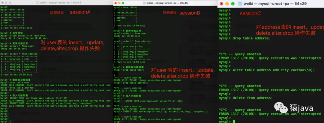 通过上述的实例可以看出,当加全局锁时,库下面所有的表都处于只读状态,不管是当前事务还是其他事务,对于库下面所有的表只能读,不能执行 insert,update,delete,alter,drop 等更新操作。