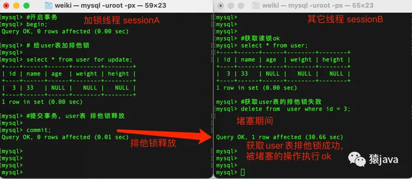 #获取 user 表上的排他锁成功,delete 操作执行 ok |