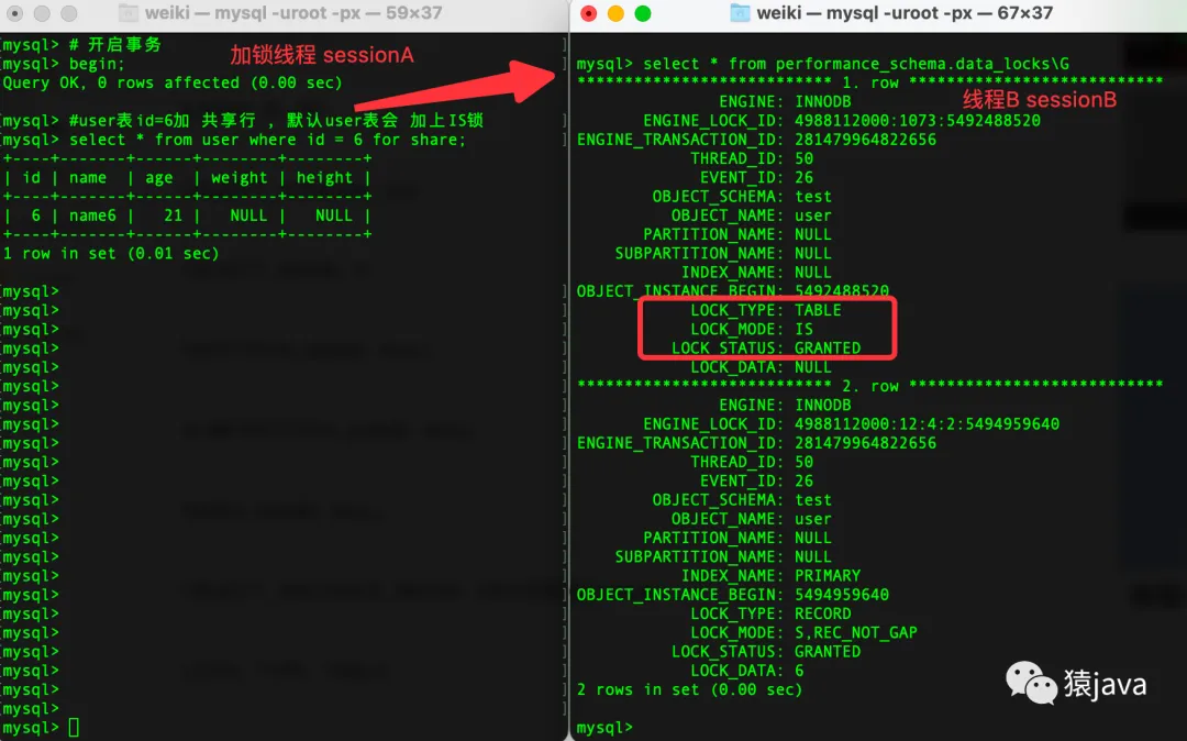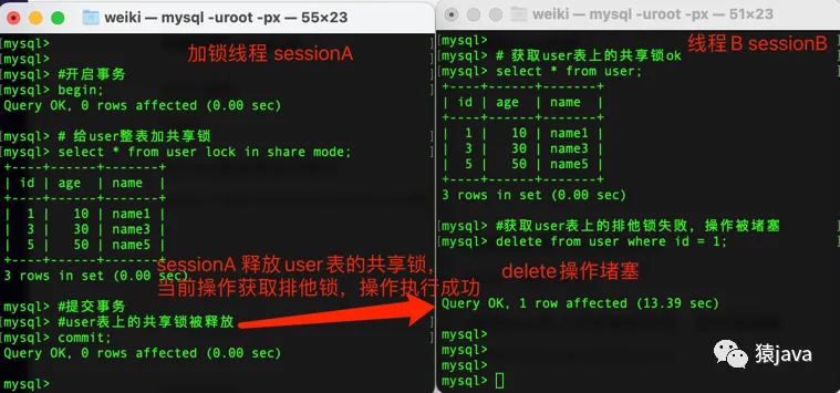 #获取 user 表 id=3 行上的共享锁 ok#select 操作执行成功select * from user where id=3; | #获取 user 表 id=3 行上的共享锁 ok#select 操作执行成功select * from user where id=3; | |