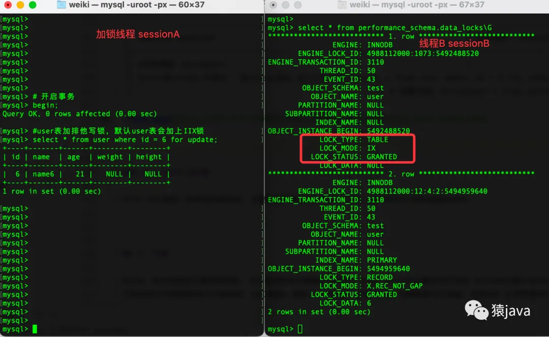 #获取 user 表 id=3 行上的排它锁失败 | #获取 user 表 id=4 行上的排它锁成功 | |
