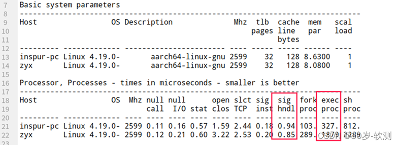 Shell命令启动时间(exec proc)、系统信号处理时间(sig hndl)、2p/16KB的上下文切换性能(2p/16k)、16p/64KB的上下文切换性能(16p/64k)、0KB文件创建时间、0KB文件删除时间(0k File Create Delete)、10KB文件创建时间、10KB文件删除时间(10k File Create Delete)。