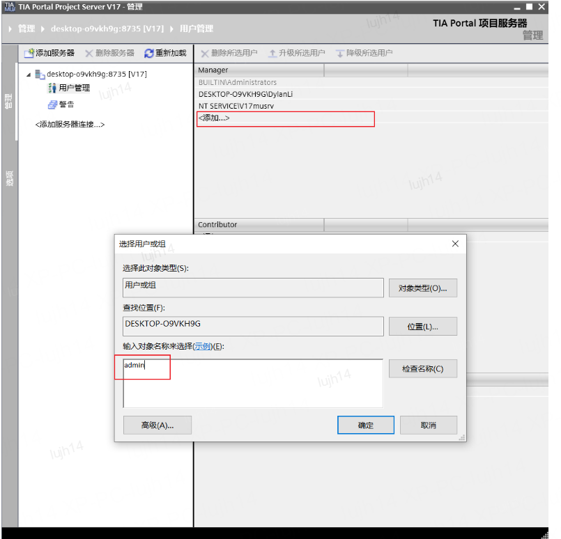 用户创建完成后,在TIA项目服务器-Configuration 里双击服务器中的用户管理-添加,这样其他电脑就能通过这个用户登录项目服务器了。