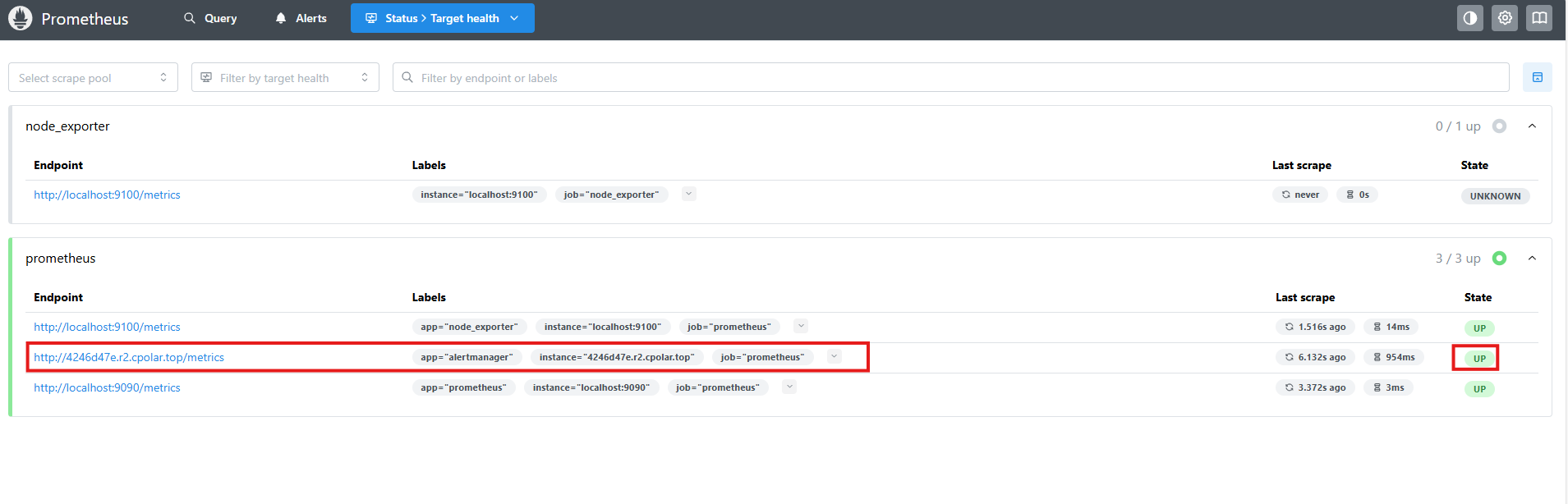 加入以下内容后:Prometheus可以通过这个公网地址4246d47e.r2.cpolar.top(刚才用cpolar打通的公网地址,也可以用localhost:9093)访问到运行在本地9093端口的Alertmanager服务,从而抓取系统指标。