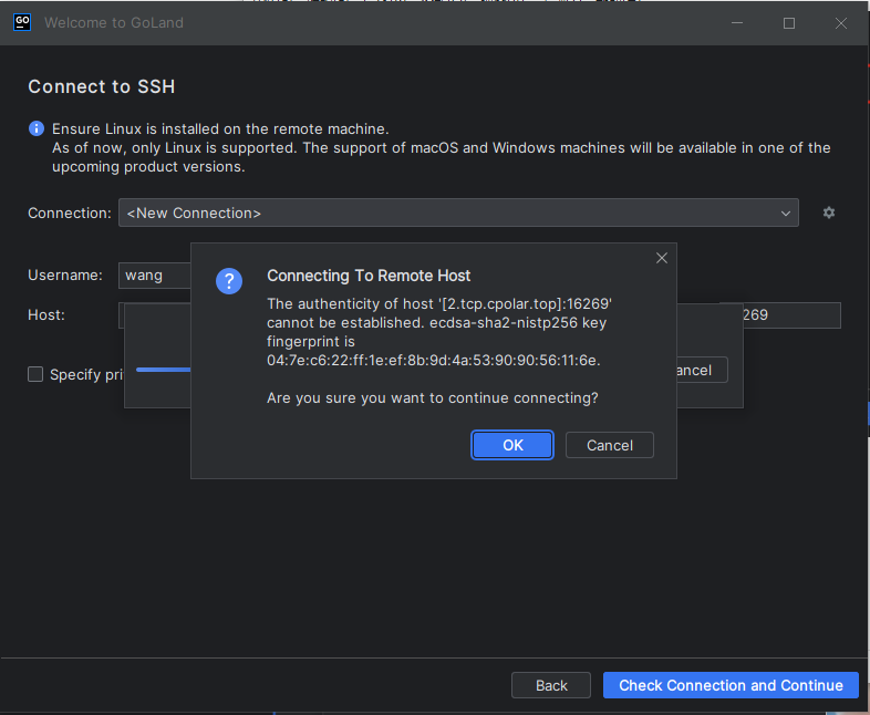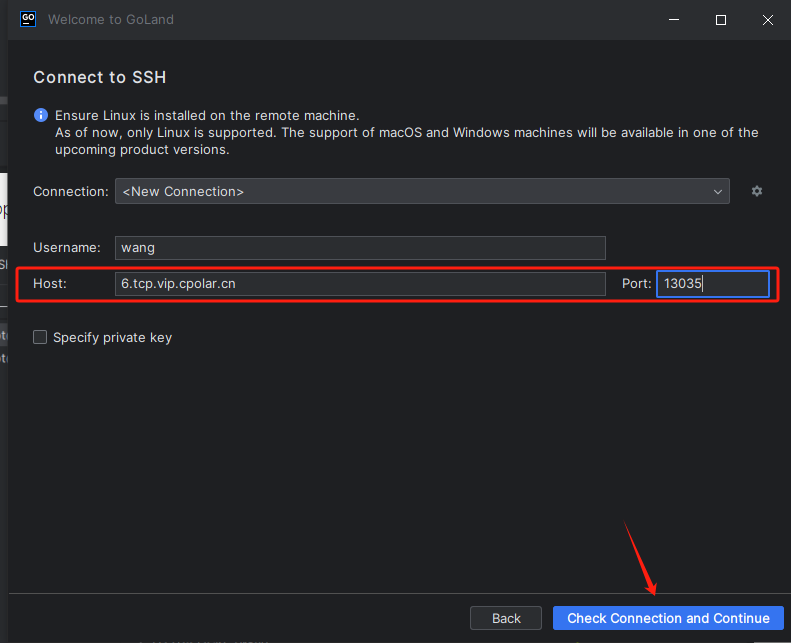 在GoLand中点击New Project,填写Username和Host(Username指服务器端用户名,Host为刚才获取的服务器本地IP地址)