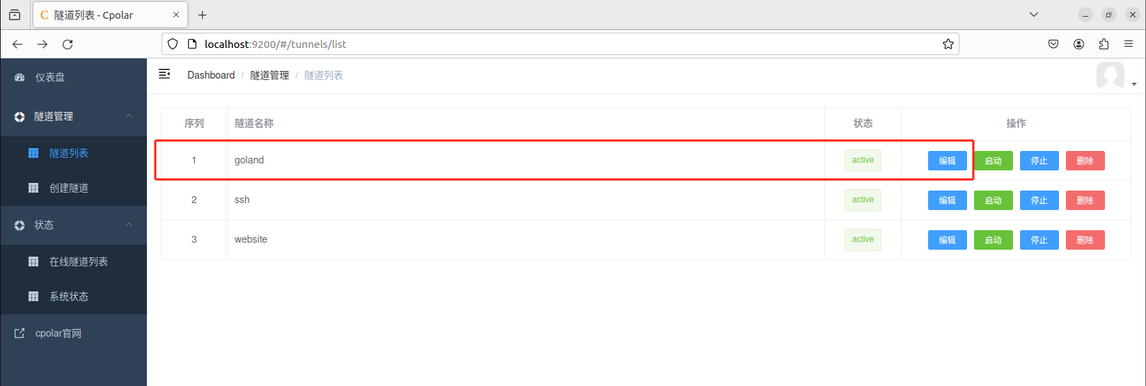 地址保留成功后,复制生成的公网地址,打开cpolar web ui管理界面,点击左侧仪表盘的隧道管理——隧道列表,找到我们上面创建的TCP隧道,点击编辑