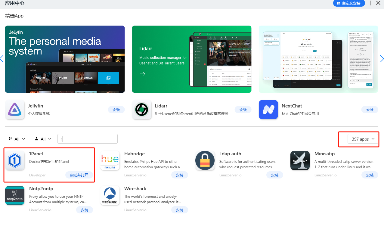 在添加应用时,就可以在应用商店中搜索1panel,出现后点击安装即可自动进行部署:
