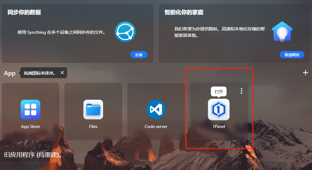 部署完成后,点击打开,即可在浏览器中访问1panel面板的web登录界面: