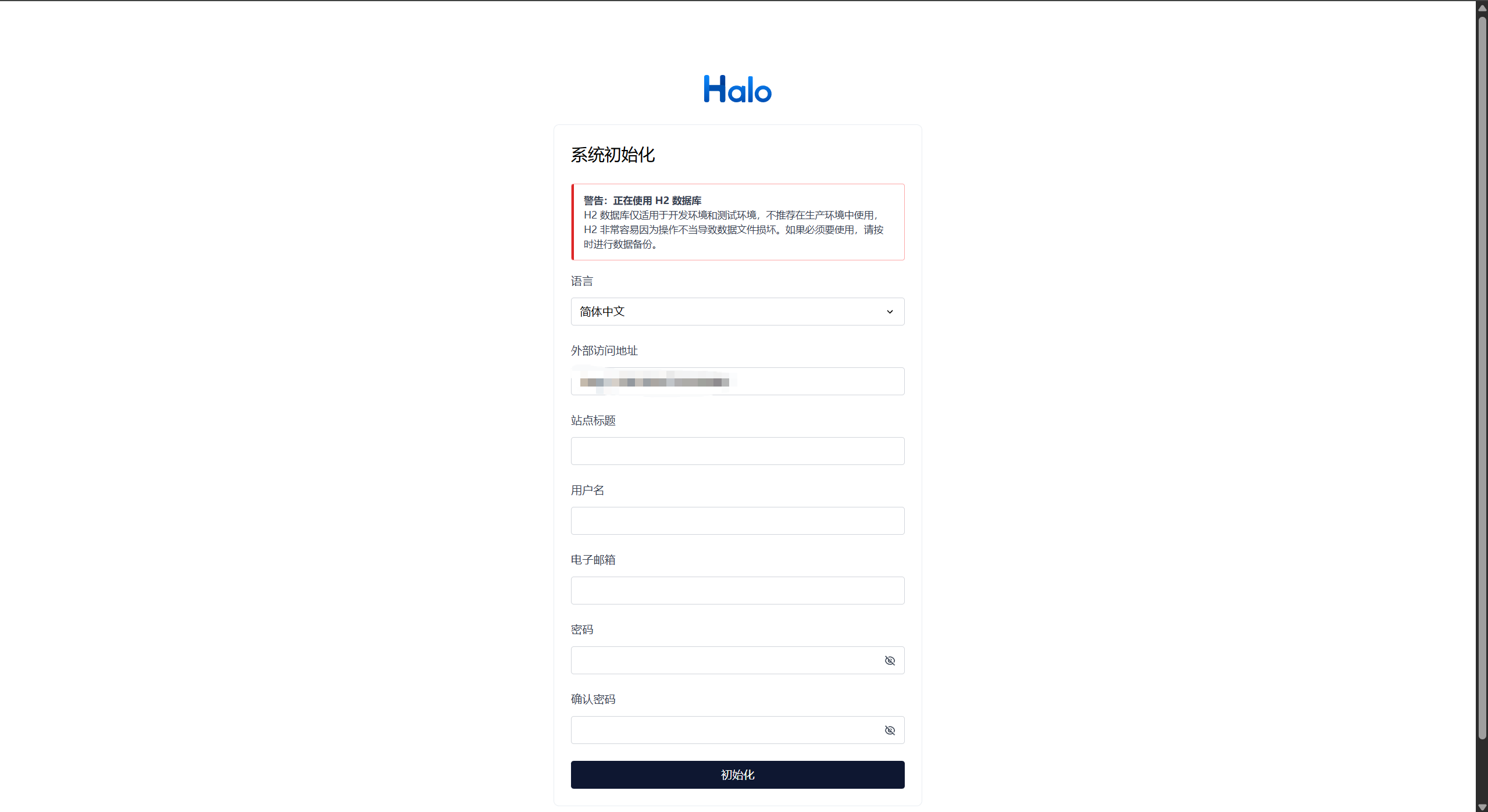 Halo部署成功后,需进行简单的初始化配置,才能正常使用,全程在浏览器中操作,无需执行命令。访问Halo初始化页面:打开浏览器,输入http://服务器公网IP:8090(如http://123.45.67.89:8090),若能看到初始化页面,说明部署正常;