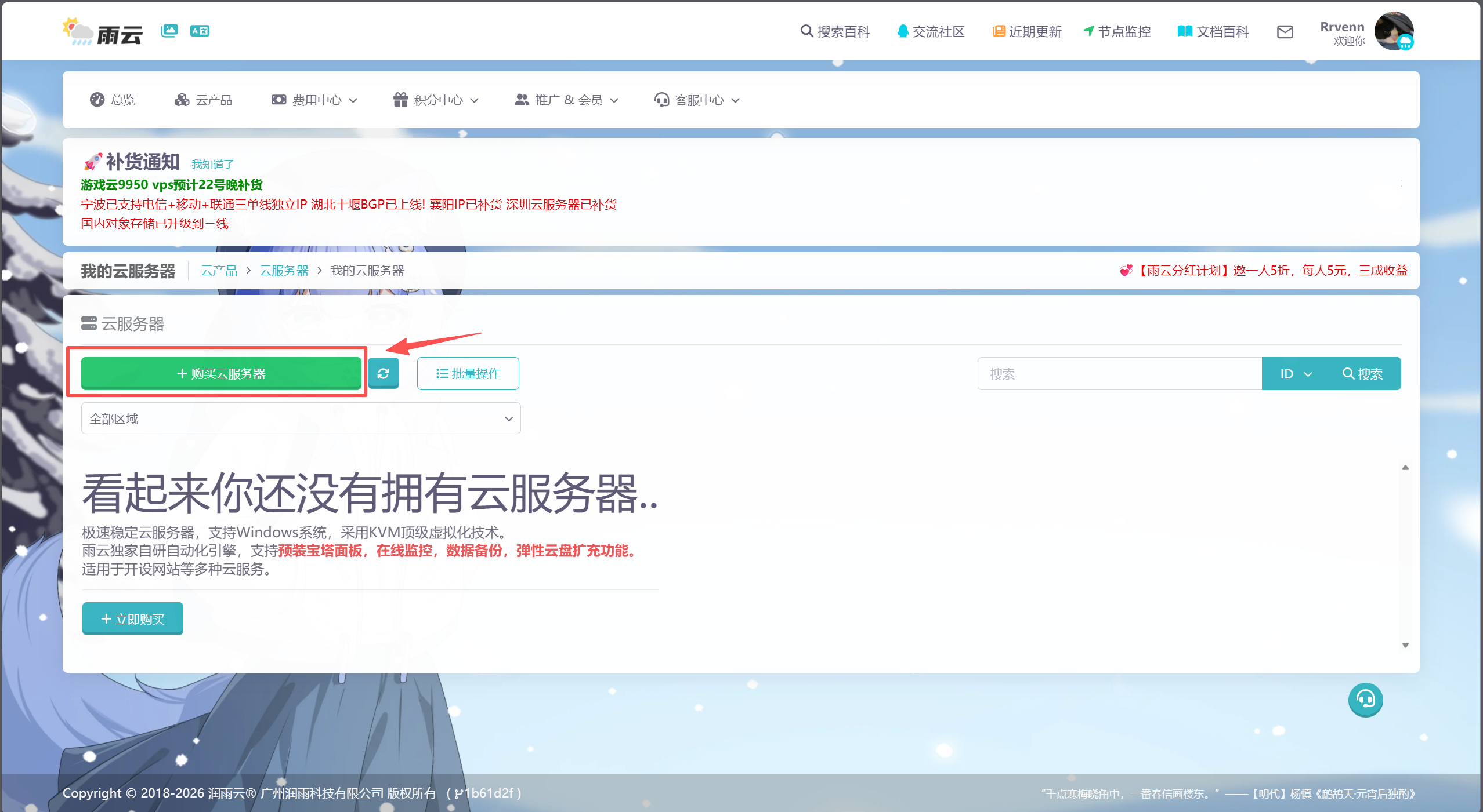 Halo的运行需要一台云服务器,雨云服务器操作简洁、性价比高,支持预安装Docker环境,能省去后续繁琐的环境配置步骤,新手优先推荐。注册后跟着博主的步骤购买雨云云服务器